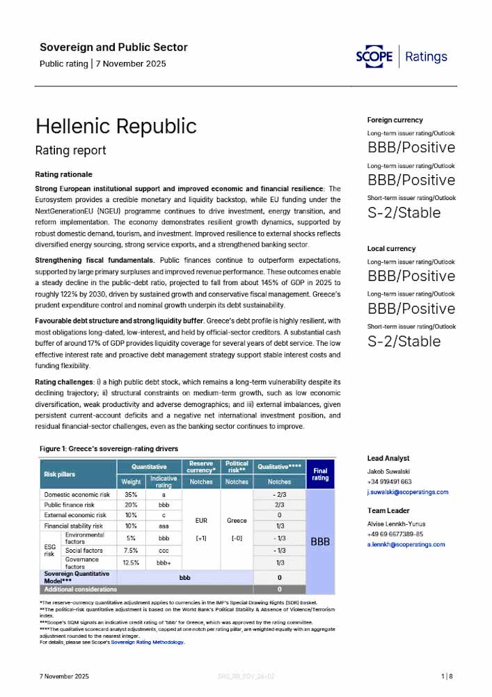 Η βελτίωση της ανθεκτικότητας της ελληνικής οικονομίας, η διατήρηση της δημοσιονομικής πειθαρχίας και η μείωση του χρέους είναι οι βασικοί οδηγοί στην απόφαση του Scope να αναθεωρήσει σε θετικές τις προοπτικές.