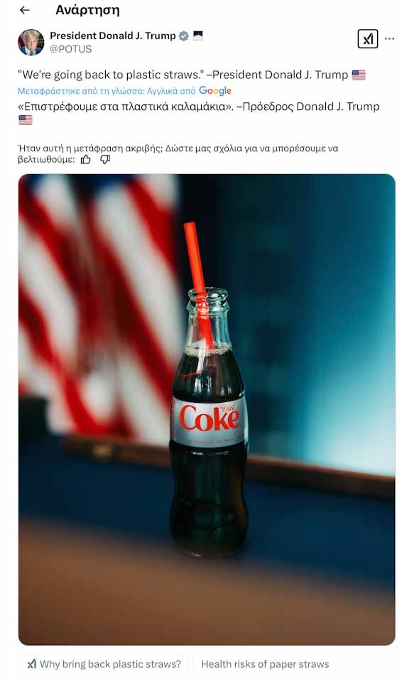 Ο Τραμπ υπέγραψε χθες, Δευτέρα, διάταγμα στο Λευκό Οίκο, στο οποίο δηλώνει πως τα υπουργεία και οι υπηρεσίες της αμερικανικής κυβέρνησης δεν πρέπει πλέον να προμηθεύονται και να χρησιμοποιούν καλαμάκια από χαρτί. Η ομάδα του αναπτύσσει επίσης μια εθνική στρατηγική για να σταματήσει η χρήση καλαμακιών από χαρτί. Οι οδηγίες κατά της χρήσης πλαστικών καλαμακιών πρόκειται να καταργηθούν.