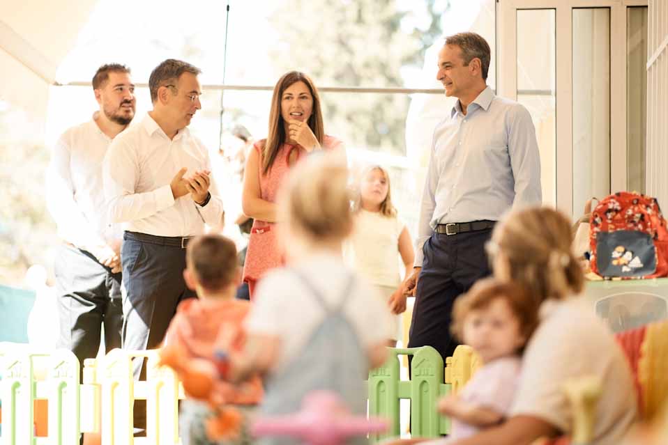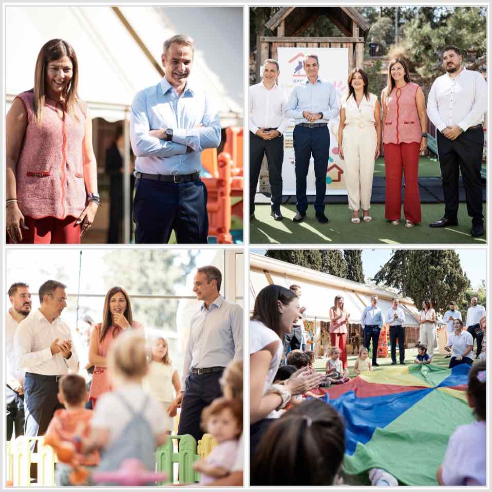 Ο Πρωθυπουργός, συνοδευόμενος από την Υπουργό Κοινωνικής Συνοχής και Οικογένειας Σοφία Ζαχαράκη, ξεναγήθηκε στους χώρους του βρεφονηπιακού σταθμού και είχε την ευκαιρία να συνομιλήσει με τα παιδιά και τους εργαζόμενους του σταθμού.
