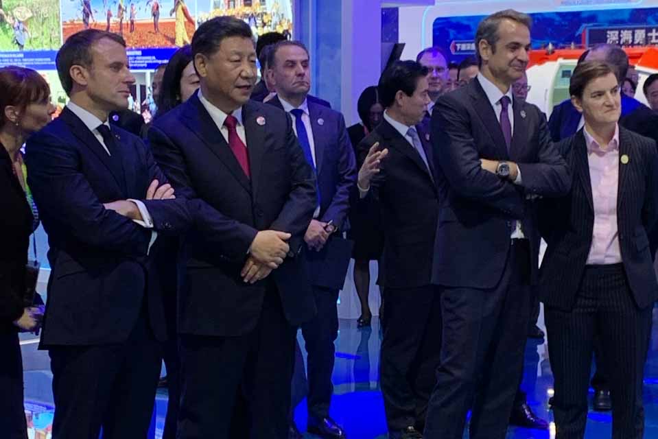Ο πρωθυπουργός Κυριάκος Μητσοτάκης, ο προεδρος της Γαλλίας Εμανουέλ Μακρόν με τον οικοδεσπότη πρόεδρο της Κίνας Σι Τζινπίνγκ, κατά την τελετή έναρξης της Διεθνούς Έκθεσης China International Import Expo 2019 στη Σαγκάη.
