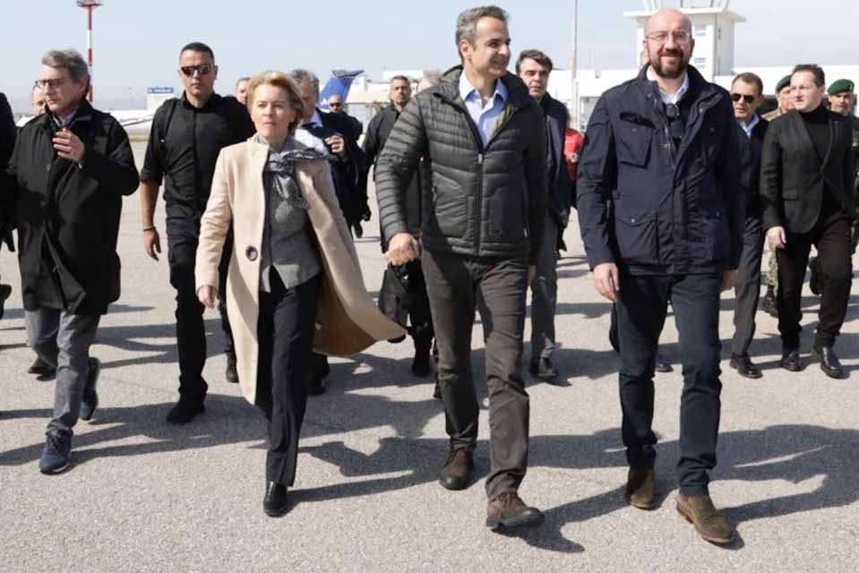 Ο πρωθυπουργός Κυριάκος Μητσοτάκης υποδέχτηκε στο αεροδρόμιο της Αλεξανδρούπολης τον πρόεδρο του Ευρωπαϊκού Συμβουλίου Σαρλς Μισέλ, την πρόεδρο της Ευρωπαϊκής Επιτροπής Ούρσουλα φον ντερ Λάιεν και τον πρόεδρο του Ευρωπαϊκού Κοινοβουλίου Νταβίντ Σασόλι.