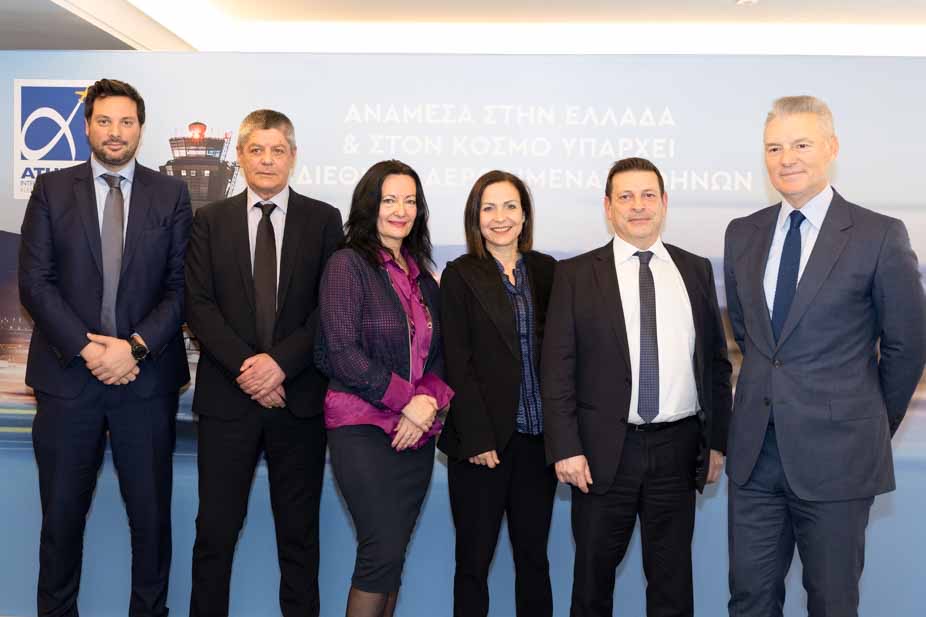 Φωτογραφία: Από δεξιά: κ. Γιάννης Παράσχης, Διευθύνων Σύμβουλος (CEO), ΔΑΑ, ο κ. Γιώργος Καλλιμασιάς, Γενικός Διευθυντής Στρατηγικής (CSO), ΔΑΑ, η κ. Νάντια Ξηρογιάννη, Διευθύντρια Οικονομικών Υπηρεσιών, ΔΑΑ, η κ. Ιωάννα Παπαδοπούλου, Διευθύντρια Επικοινωνίας & Marketing, ΔΑΑ, ο κ. Παναγιώτης Μιχαλαρόγιαννης, Γενικός Οικονομικός Διευθυντής (CFO), ΔΑΑ και ο κ. Γιώργος Ελευθερίου, Διευθυντής Επενδυτικών Σχέσεων, ΔΑΑ