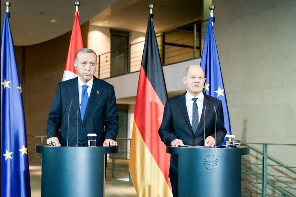 Σταθεροί στις θέσεις τους για την κρίση στη Μέση Ανατολή παρέμειναν τόσο ο καγκελάριος Όλαφ Σολτς όσο και ο πρόεδρος της Τουρκίας Ταγίπ Ερντογάν, κατά την εμφάνισή τους νωρίτερα απόψε ενώπιον του Τύπου, πριν από το δείπνο εργασίας τους στην καγκελαρία.