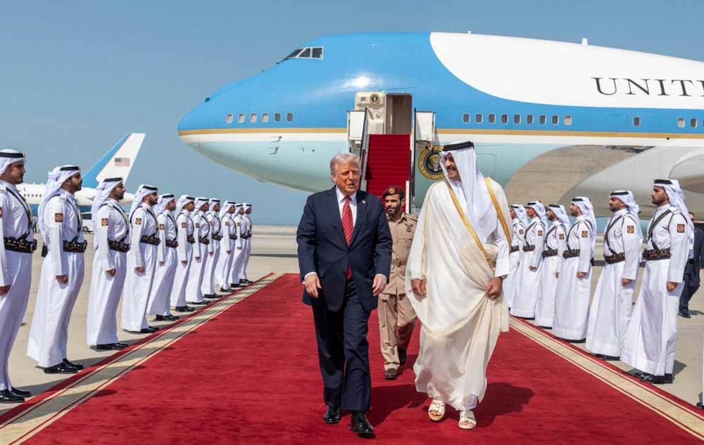 Ο πρόεδρος Ντόναλντ Τραμπ γίνεται δεκτός από τον Εμίρη του Κατάρ, σεΐχη Ταμίμ μπιν Χαμάντ Αλ Θάνι, κατά την άφιξή του με το προεδρικό αεροσκάφος Air Force One στο Διεθνές Αεροδρόμιο Χαμάντ, στην Ντόχα του Κατάρ.
