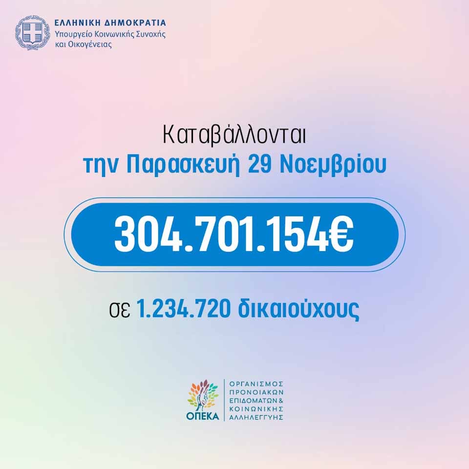 Το Υπουργείο Κοινωνικής Συνοχής και Οικογένειας, με τον εποπτευόμενο Οργανισμό Προνοιακών Επιδομάτων και Κοινωνικής Αλληλεγγύης (ΟΠΕΚΑ), ενημερώνουν ότι την Παρασκευή 29 Νοεμβρίου, θα καταβληθούν τα επιδόματα για τον μήνα Νοέμβριο, συνολικού ύψους 304.701.154 ευρώ.