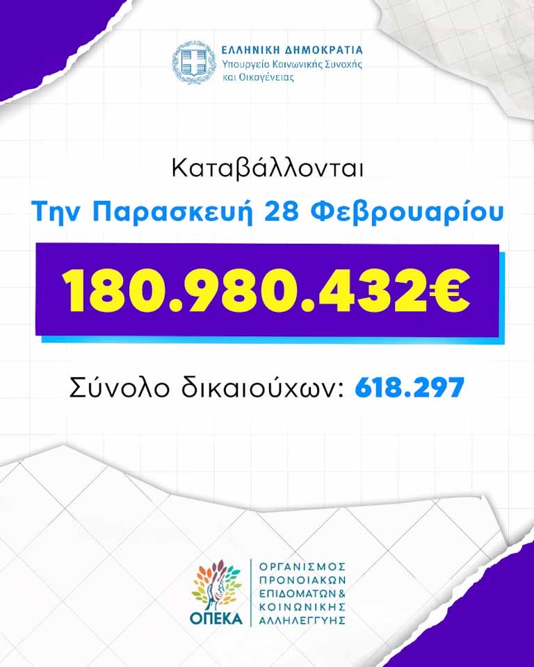 Το Υπουργείο Κοινωνικής Συνοχής και Οικογένειας, με τον εποπτευόμενο Οργανισμό Προνοιακών Επιδομάτων και Κοινωνικής Αλληλεγγύης (ΟΠΕΚΑ), ενημερώνουν ότι την Παρασκευή 28/02, θα καταβληθούν τα επιδόματα για τον μήνα Φεβρουάριο, συνολικού ύψους 180.980.432 ευρώ.