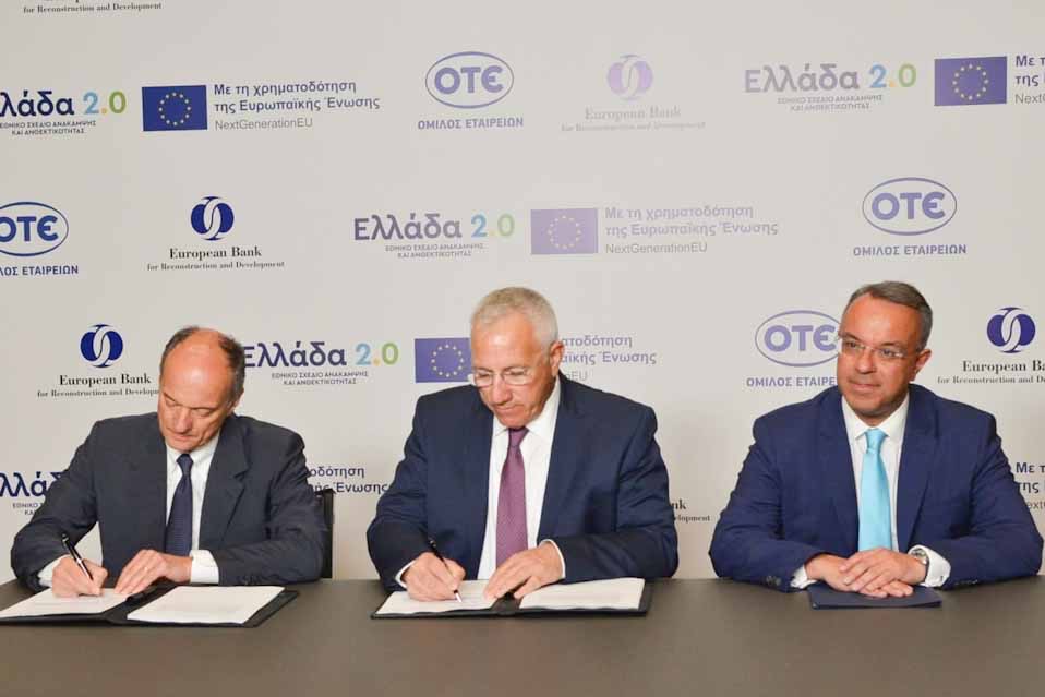 Υπογράφηκε σήμερα παρουσία του υπουργού οικονομικών Χρήστου Σταικούρα, μεταξύ του ΟΤΕ και της Ευρωπαϊκής Τράπεζας Ανασυγκρότησης και Ανάπτυξης (EBRD), δανειακή σύμβαση ύψους €150 εκατ. στο πλαίσιο του Εθνικού Σχεδίου Ανάκαμψης και Ανθεκτικότητας «Ελλάδα 2.0».