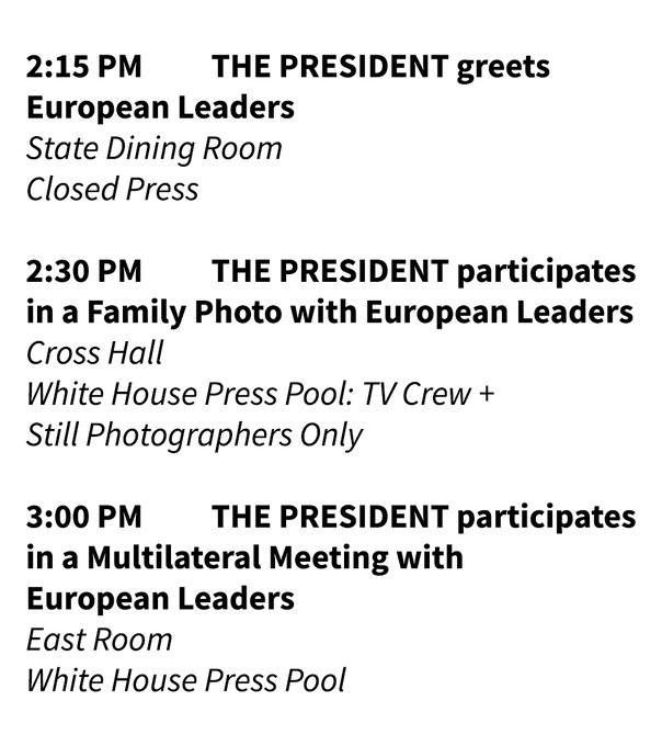 Ο Ουκρανός πρόεδρος θα έχει αρχικά συνομιλίες μόνο με τον Τραμπ στις 13:00 (τοπική ώρα, 20:00 ώρα Ελλάδας). Στη συνέχεια θα πάρουν μέρος στις συζητήσεις και οι Ευρωπαίοι ηγέτες.