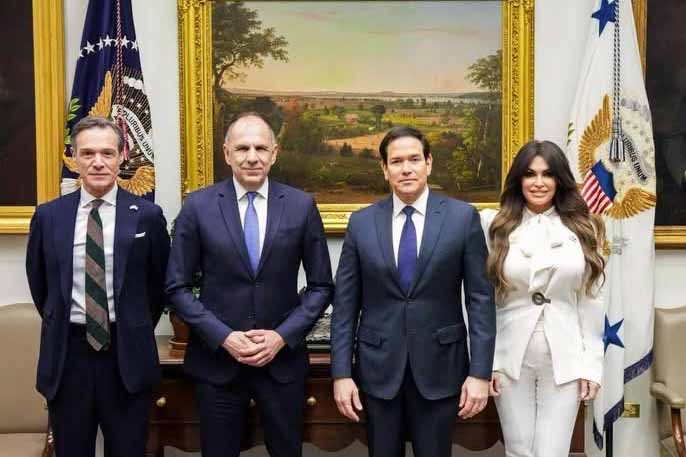«Ο υπουργός Εξωτερικών των ΗΠΑ Μάρκο Ρούμπιο συναντήθηκε σήμερα με τον Έλληνα υπουργό Εξωτερικών Γιώργο Γεραπετρίτη με στόχο την περαιτέρω ενίσχυση της στρατηγικής εταιρικής σχέσης ΗΠΑ και Ελλάδας. Οι δύο πλευρές συζήτησαν την επέκταση της συνεργασίας στους τομείς της ενέργειας και των εμπορικών σχέσεων, την προώθηση της ευρωπαϊκής άμυνας και της περιφερειακής ασφάλειας, καθώς και την αντιμετώπιση της παράτυπης μετανάστευσης».
