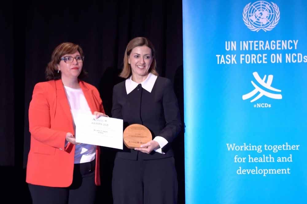Για πρώτη φορά η Ελλάδα βραβεύεται από τον ΟΗΕ. Η Αναπληρώτρια Υπουργός Υγείας Ειρήνη Αγαπηδάκηέλαβε χθες στη Νέα Υόρκη διεθνές βραβείο για τις επιδόσεις της χώρας μας στην πρόληψη των χρονίων νοσημάτων και την παιδική παχυσαρκία, σε ειδική τελετή απονομής που διοργανώθηκε από τον ΟΗΕ και τον Παγκόσμιο Οργανισμό Υγείας. Αξίζει να σημειωθεί ότι η Ελλάδα ήταν ανάμεσα στις λίγες υποψήφιες χώρες παγκοσμίως που διεκδίκησαν τη διάκριση.