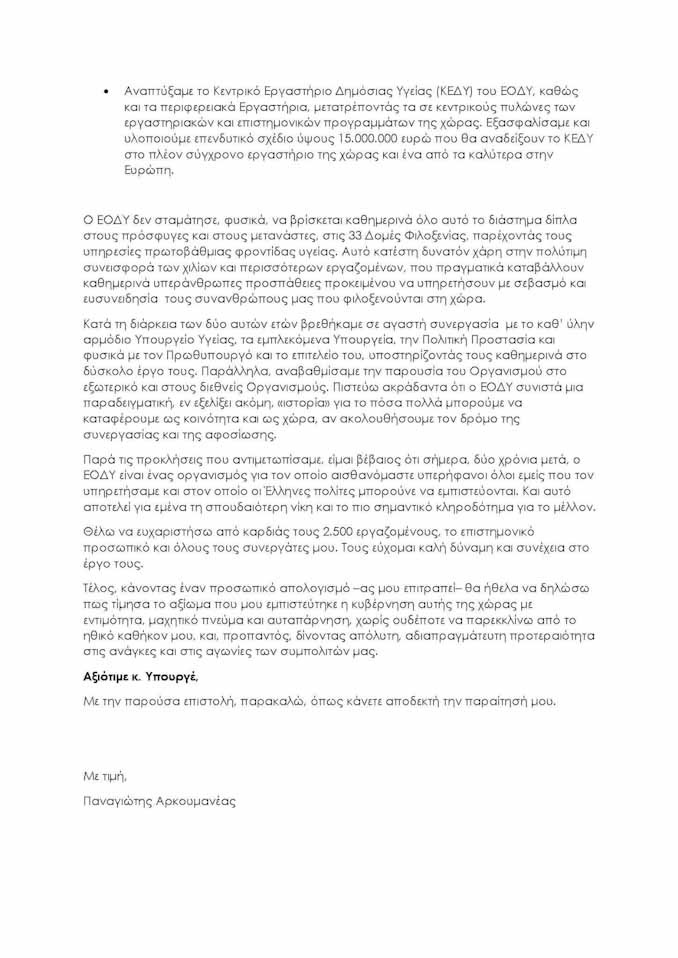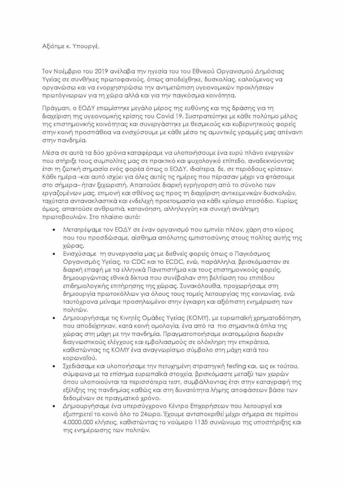 Μάλιστα, δημοσιοποίησε την επιστολή του στα social media, αναφέροντας στο μήνυμά του τα εξής: «Θέλω να ευχαριστήσω από καρδιάς τους 2.500 εργαζομένους του ΕΟΔΥ, το επιστημονικό προσωπικό και όλους τους συνεργάτες μου. Τους εύχομαι καλή δύναμη και συνέχεια στο έργο τους. Τέλος, κάνοντας έναν προσωπικό απολογισμό –ας μου επιτραπεί– θα ήθελα να δηλώσω πως τίμησα το αξίωμα που μου εμπιστεύτηκε η κυβέρνηση αυτής της χώρας με εντιμότητα, μαχητικό πνεύμα και αυταπάρνηση, χωρίς ουδέποτε να παρεκκλίνω από το ηθικό καθήκον μου, και, προπαντός, δίνοντας απόλυτη, αδιαπραγμάτευτη προτεραιότητα στις ανάγκες και στις αγωνίες των συμπολιτών μας».