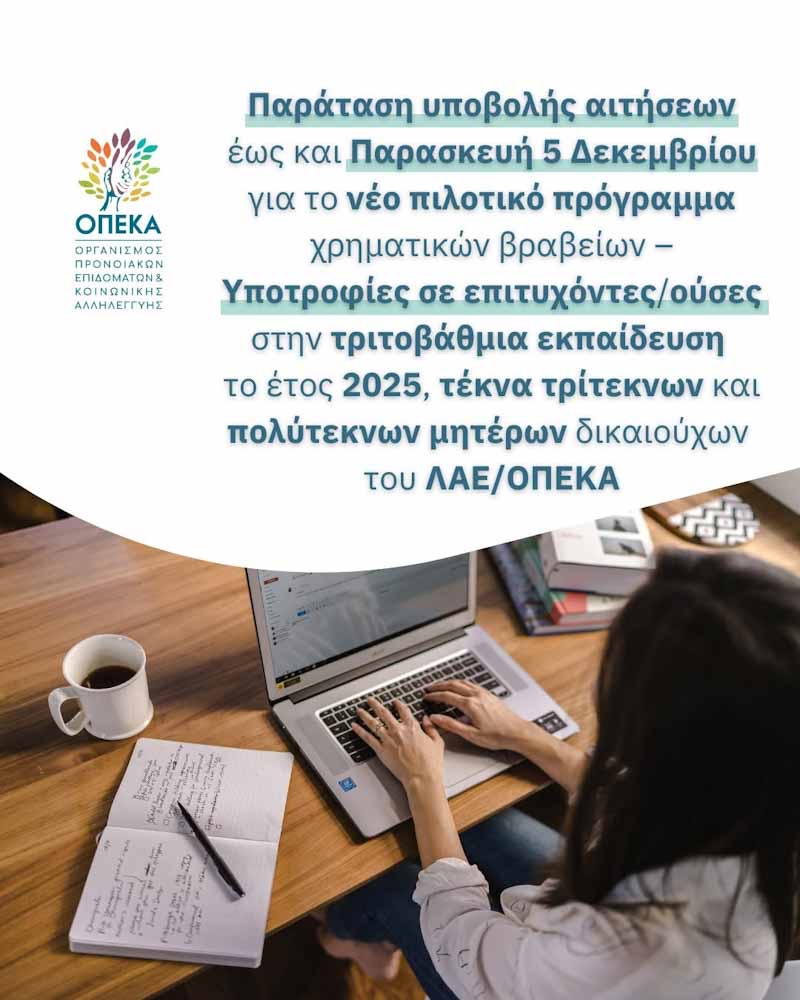 Το Υπουργείο Κοινωνικής Συνοχής και Οικογένειας και ο Οργανισμός Προνοιακών Επιδομάτων και Κοινωνικής Αλληλεγγύης (ΟΠΕΚΑ) ανακοινώνουν ότι η υποβολή αιτήσεων για το νέο πιλοτικό πρόγραμμα χρηματικών βραβείων – Υποτροφίες σε επιτυχόντες-ούσες μαθητές-τριες στις πανελλαδικές εξετάσεις το έτος 2025 στην τριτοβάθμια εκπαίδευση που έληγε την 1η Δεκεμβρίου παρατείνεται έως και την Παρασκευή 5 Δεκεμβρίου 2025.