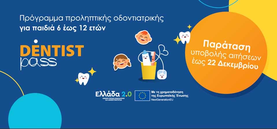 Παρατείνεται η προθεσμία υποβολής αιτήσεων για το πρόγραμμα Dentist pass έως τις 22 Δεκεμβρίου 2023, προκειμένου να ωφεληθεί ακόμα μεγαλύτερος αριθμός παιδιών, σύμφωνα με ανακοίνωση της Κοινωνίας της Πληροφορίας Μ.Α.Ε. που υλοποιεί το πρόγραμμα, στο πλαίσιο του Εθνικού Σχεδίου Ανάκαμψης και Ανθεκτικότητας Ελλάδα 2.0 με τη χρηματοδότηση της Ευρωπαϊκής Ένωσης-NextGenerationEU.
