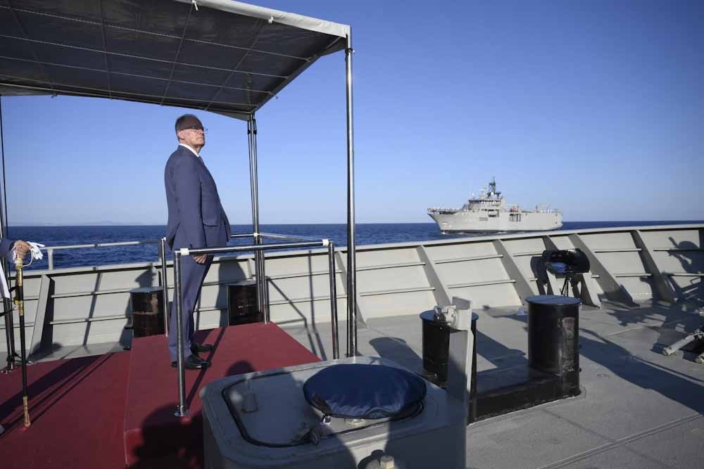 Ο Υπουργός Εθνικής Άμυνας Νίκος Δένδιας, παρέστη χθες, Δευτέρα 30 Ιουνίου 2025, ως εκπρόσωπος του Προέδρου της Κυβέρνησης, στην Επιθεώρηση του Στόλου από τον Πρόεδρο της Δημοκρατίας, Κωνσταντίνο Τασούλα, τον οποίο υποδέχθηκε στην Ακτή Μιαούλη του Λιμένος Πειραιώς και συνόδευσε εν πλω, επί της φρεγάτας «ΣΠΕΤΣΑΙ», στον Σαρωνικό Κόλπο.