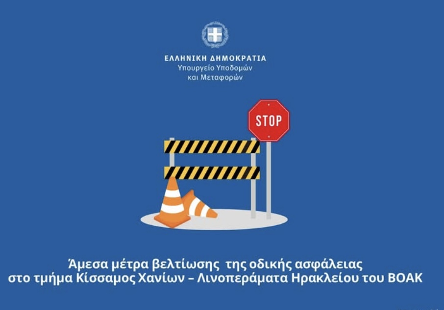 Το Υπουργείο Υποδομών και Μεταφορών προχωρά στην άμεση λήψη μέτρων με σκοπό τη βελτίωση της οδικής ασφάλειας στον Βόρειο Οδικό Άξονα Κρήτης (ΒΟΑΚ) στο τμήμα από την Κίσσαμο Χανίων μέχρι τα Λινοπεράματα Ηρακλείου.