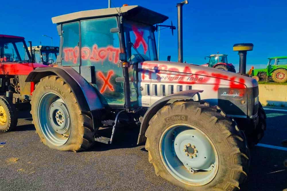 Περιστατικό φθορών σημειώθηκε νωρίς το πρωί στο μπλόκο της Νίκαιας, όταν αγρότες διαπίστωσαν ότι άγνωστοι έγραψαν με μπογιά στα τρακτέρ δύο συναδέλφων τους που συμμετείχαν στη χθεσινή σύσκεψη στο Μέγαρο Μαξίμου, ενώ παράλληλα ξεφούσκωσαν τα λάστιχα γεωργικών μηχανημάτων.