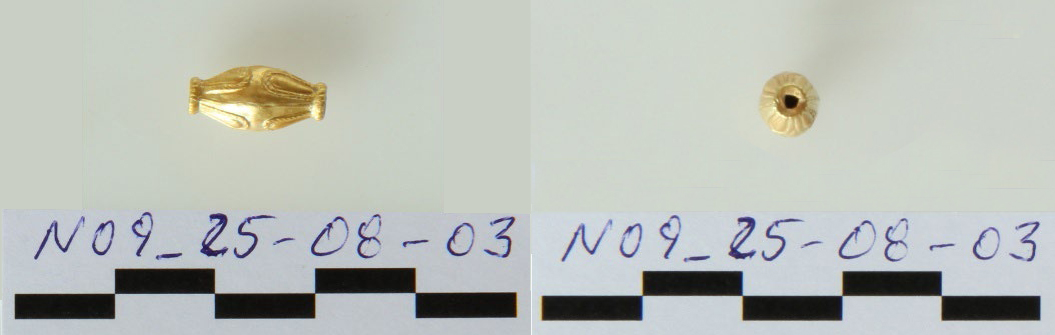Κατά τη διάνοιξη ανασκαφικής τομής στο εσωτερικό μεγάλης λιθόκτιστης κατασκευής, που βρίσκεται εξωτερικά και σε άμεση γειτνίαση με τα κατάλοιπα του τείχους που προστάτευε την επέκταση του οικισμού της Μέσης Εποχής του Χαλκού (το λεγόμενο «εσωτερικό προάστιο») βρέθηκαν οκτώ χρυσά διμερή δισκοειδή περίαπτα, ένα χρυσό δισκοειδές περίαπτο, επτά χρυσές αμφικωνικές ψήφοι, μία χρυσή κυλινδρική ψήφος, οκτώ διακοσμητικά ελάσματα από φύλλο χρυσού και επτά σφαιρικές ψήφοι από καρνεόλη. Όλα πιθανόν ανήκουν σε ένα χρυσό περιδέραιο ή κρεμαστό αντικείμενο, χρονολογούνται στο πρώτο μισό της δεύτερης χιλιετίας π.Χ. και διατηρούνται σε άριστη κατάσταση. Επιπλέον βρέθηκαν δώδεκα θραύσματα χαλκού που πιθανόν προέρχονται από μαχαιρίδια και μία βελόνη/περόνη.