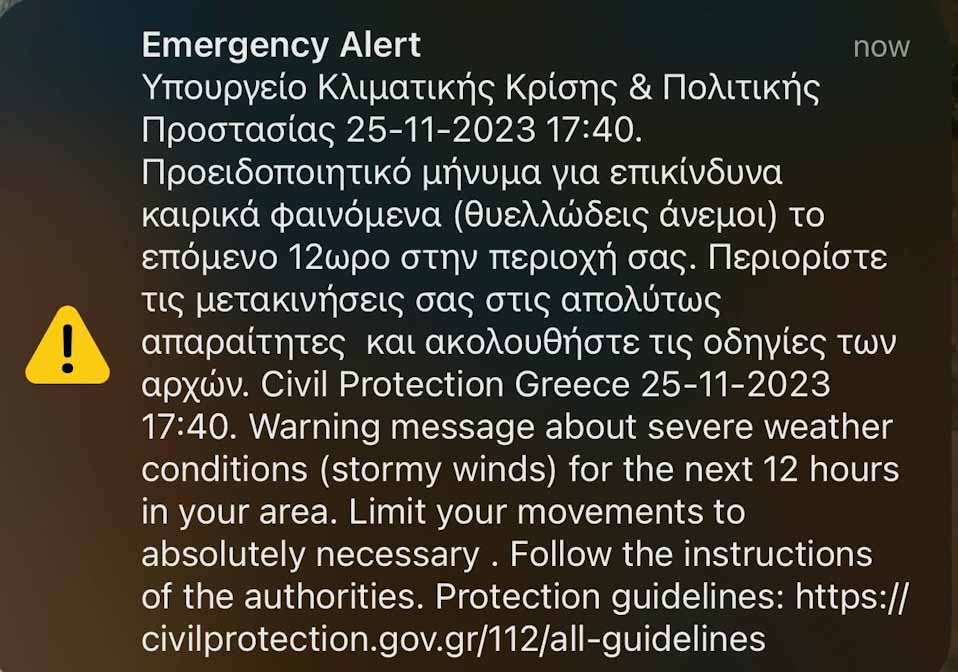 Προειδοποιητικό μήνυμα 112 από το υπουργείο Κλιματικής Κρίσης και Πολιτικής Προστασίας σε πολλές περιοχές της Αττικής παρελήφθη στα κινητά κατοίκων, συμπεριλαμβανομένων των Δήμων Αγ.Παρασκευής, Αχαρνών, Αλίμου, Πετρούπολης. Βούλας, Περιστερίου, Βραυρώνας, ενόψει της κακοκαιρίας.