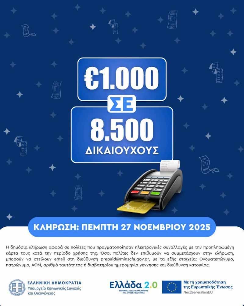 Η δημόσια κλήρωση θα πραγματοποιηθεί στις 27 Νοεμβρίου και αφορά τους πολίτες που πραγματοποίησαν ηλεκτρονικές συναλλαγές με την προπληρωμένη κάρτα τους κατά την περίοδο χρήσης της.