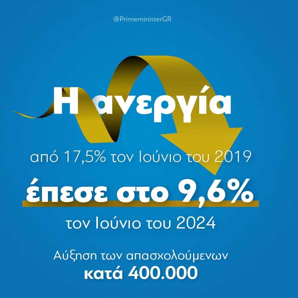 «Τελευταία ημέρα του Ιουλίου σήμερα και θα ήθελα να κλείσω τον μήνα με ένα πολύ θετικό νέο. Σύμφωνα με την ΕΛΣΤΑΤ η ανεργία στην πατρίδα μας τον Ιούνιο έπεσε στο 9,6%, από 10,3% τον Μάιο. Πρόκειται για το χαμηλότερο επίπεδο από τον αντίστοιχο μήνα του 2009!