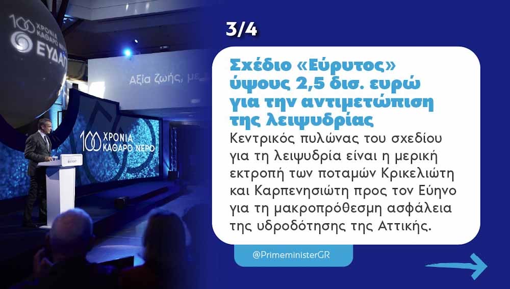 Μια εξίσου πολύ μεγάλη παρέμβαση επιχειρούμε και στο μέτωπο της αντιμετώπισης της λειψυδρίας. Είναι ένα φιλόδοξο επενδυτικό σχέδιο ύψους 2,5 δισ. ευρώ για να ενισχύσουμε τις υδροδοτικές υποδομές σε όλη τη χώρα, να αναβαθμίσουμε τα δίκτυα, να περιορίσουμε τη σπατάλη και να αξιοποιήσουμε ξανά το νερό που σήμερα χάνεται. Κεντρικός πυλώνας αυτής της παρέμβασης είναι το σχέδιο «Εύρυτος» που προβλέπει τη μερική εκτροπή των ποταμών Κρικελιώτη και Καρπενησιώτη προς τον Εύηνο, εξασφαλίζοντας έτσι μακροπρόθεσμη ασφάλεια υδροδότησης της Αττικής, όπου κατοικεί σχεδόν ο μισός πληθυσμός της χώρας. Ανάλογες παρεμβάσεις θα γίνουν και σε άλλες περιοχές με μεγάλη συγκέντρωση πληθυσμού, όπως η Θεσσαλονίκη, καθώς και στα νησιά μας. Όπως είπα και στην εκδήλωση για τα 100 χρόνια της ΕΥΔΑΠ, πρέπει να είμαστε έτοιμοι για το χειρότερο, γι’ αυτό προχωράμε σε πρωτοβουλίες και επενδύσεις που θα εξασφαλίσουν ότι θα συνεχίσουμε να έχουμε το καλύτερο αλλά και το φθηνότερο νερό στην Ευρώπη. Η Κυβέρνηση δεσμεύεται για την προστασία του νερού ως υπέρτατου δημόσιου αγαθού και επαναλαμβάνω ότι, χάρη στη δική μας πολιτική, οι εταιρείες ύδρευσης επέστρεψαν στον αυστηρό έλεγχο του κράτους από το χαρτοφυλάκιο του Υπερταμείου, με το 51% της ΕΥΔΑΠ και ΕΥΑΘ να ανήκει στο ελληνικό Δημόσιο. Και αυτό δεν πρόκειται να αλλάξει.