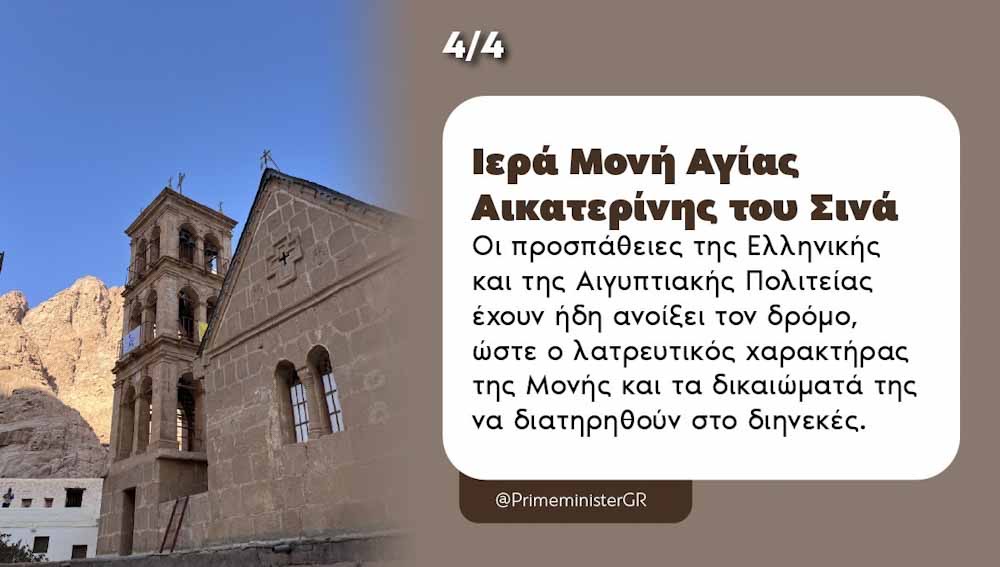 Παράλληλα αναφέρθηκε στη Μονή Σινά τονίζοντας ότι «οι προσπάθειες της Ελληνικής και της Αιγυπτιακής Πολιτείας έχουν, ήδη, ανοίξει τον δρόμο ώστε ο λατρευτικός χαρακτήρας της Μονής και τα δικαιώματά της να διατηρηθούν στο διηνεκές». Ειδική αναφορά έκανε και στον ΟΠΕΚΕΠΕεπισημαίνοντας ότι είναι «η πιο δύσκολη μεταρρύθμιση που μπορώ να θυμηθώ».