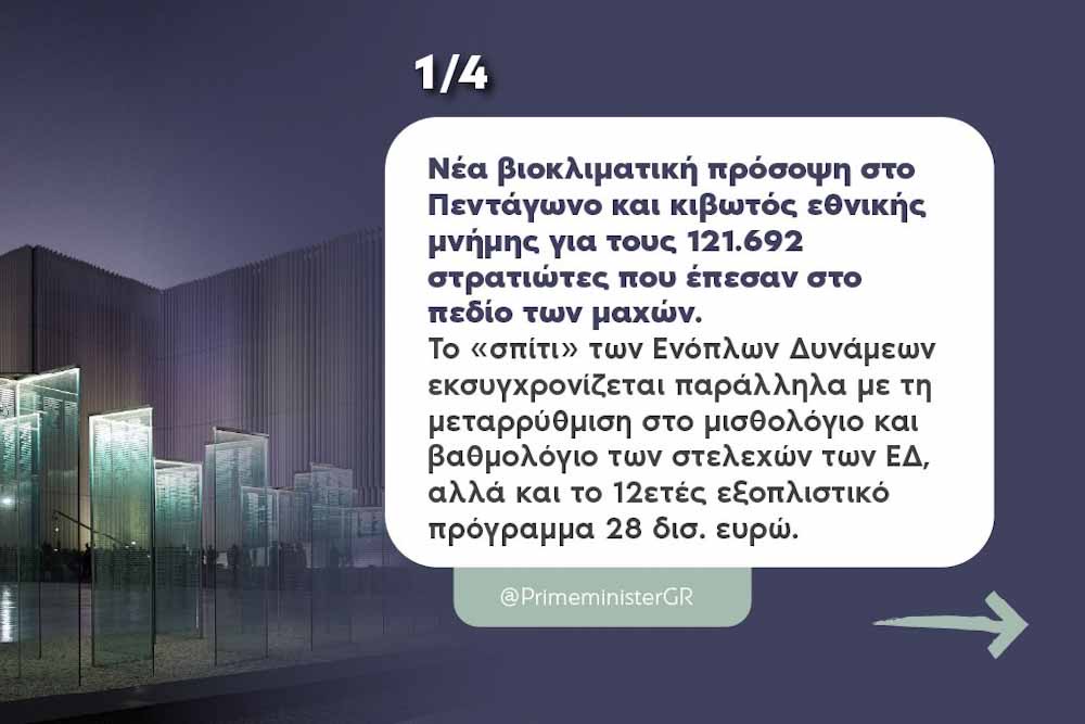 Με αναφορά, στο αγεννημένο Πεντάγωνο και τη νέα βιοκλιματική πρόσοψή του που αποκαλύφθηκε την επομένη της εθνικής επετείου της 28ης Οκτωβρίου έκανε στο εβδομαδιαίο μήνυμά του ο Πρωθυπουργός, ο οποίος αναφέρθηκε και στις αυξήσεις σταστελέχη των Ενόπλων Δυνάμεων που υπολογίζονται, κατά μέσο όρο, στα 145 ευρώ τον μήνα. Σχολιάζοντας την πρόσφατη περιπέτεια της υγείας του ο Κυριάκος Μητσοτάκης δήλωσε, μεταξύ άλλων, ότι «μπαίνουμε στον Νοέμβριο με έργα σε εξέλιξη και πολλή όρεξη για δουλειά».