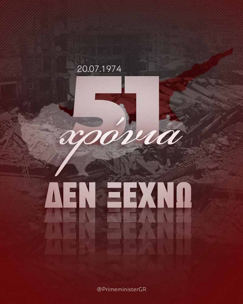 Το σύνθημα «Δεν Ξεχνώ», άλλωστε, παραμένει επίκαιρο. Στην Κύπρο, με τη διαρκή και μεθοδική προσπάθεια για την αποκατάσταση των κυριαρχικών της δικαιωμάτων. Και στην Ελλάδα, με τη συνεχή θωράκιση της αμυντικής και διπλωματικής της ισχύος. Ο αγώνας για τη δικαίωση είναι κοινός. Και θα είναι νικηφόρος. Όπως το θέλουν η Ευρώπη, οι λαοί του κόσμου και η ίδια η Ιστορία.