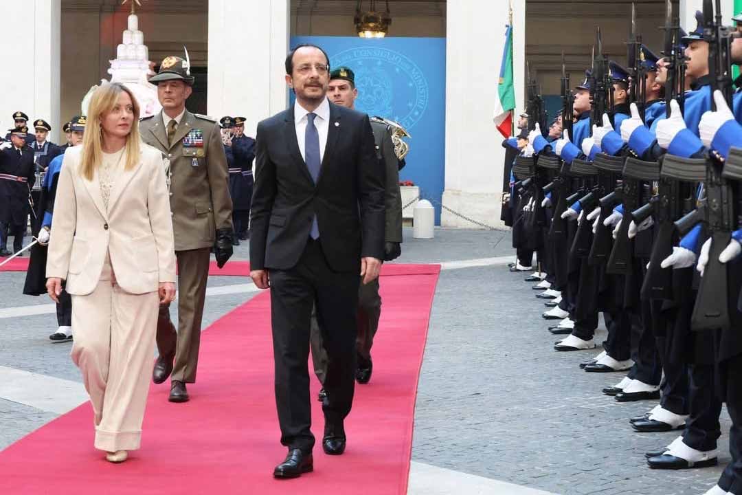 Ο Πρόεδρος της Δημοκρατίας έφθασε στο Πρωθυπουργικό Μέγαρο στις 17:00 (ώρα Κύπρου), όπου τον υποδέχθηκε η Πρωθυπουργός της Ιταλίας, ενώ στρατιωτικό άγημα απέδιδε τιμές.