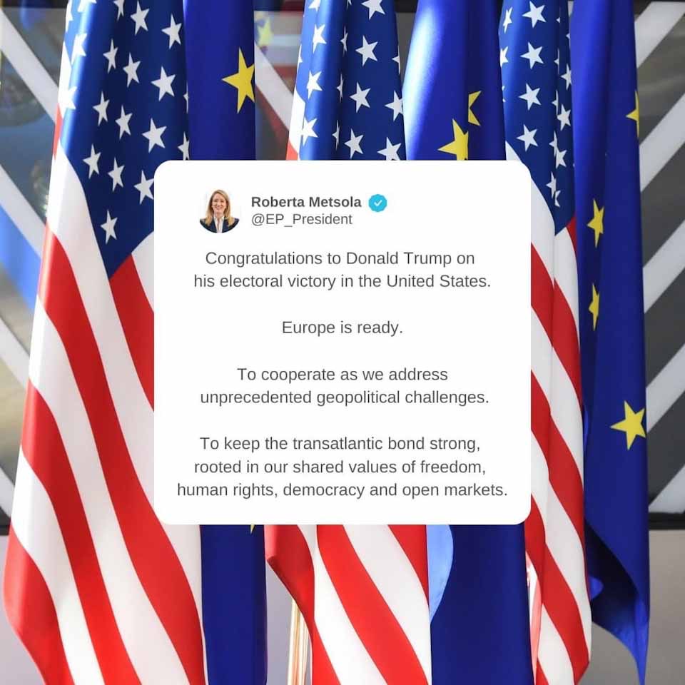 «Η Ευρώπη είναι έτοιμη να συνεργαστούμε καθώς αντιμετωπίζουμε άνευ προηγουμένου γεωπολιτικές προκλήσεις», τονίζει η Πρόεδρος του Ευρωπαϊκού Κοινοβουλίου Ρομπέρτα Μέτσολα στο συγχαρητήριο μήνυμά της προς τον Πρόεδρο των ΗΠΑ Ντόναλντ Τραμπ. Έτοιμοι να συνεργαστούμε «για διατηρήσουμε τον διατλαντικό δεσμό ισχυρό, ριζωμένο στις κοινές μας αξίες της ελευθερίας, των ανθρωπίνων δικαιωμάτων, της δημοκρατίας και των ανοιχτών αγορών”, προσθέτει η Πρόεδρος του ΕΚ.