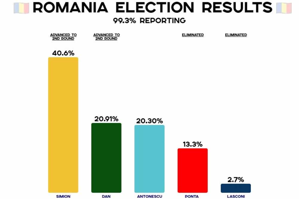 Έχοντας συγκεντρώσει περίπου το 40,6% των ψήφων στον πρώτο γύρω των προεδρικών εκλογών στη Ρουμανία ο υποψήφιος της ακροδεξιάς και ευρωσκεπτικιστής, Τζορτζε Σιμιόν, φαντάζει ως το μεγάλο φαβορί έναντι του δημάρχου του Βουκουρεστίου Νικουσόρ Νταν που βρέθηκε στη δεύτερη θέση με 20,91%, με καταμετρημένο το 99,6% των εκλογικών τμημάτων. Οι δυο τους θα αναμετρηθούν στον δεύτερο γύρο στις 18 Μαΐου.