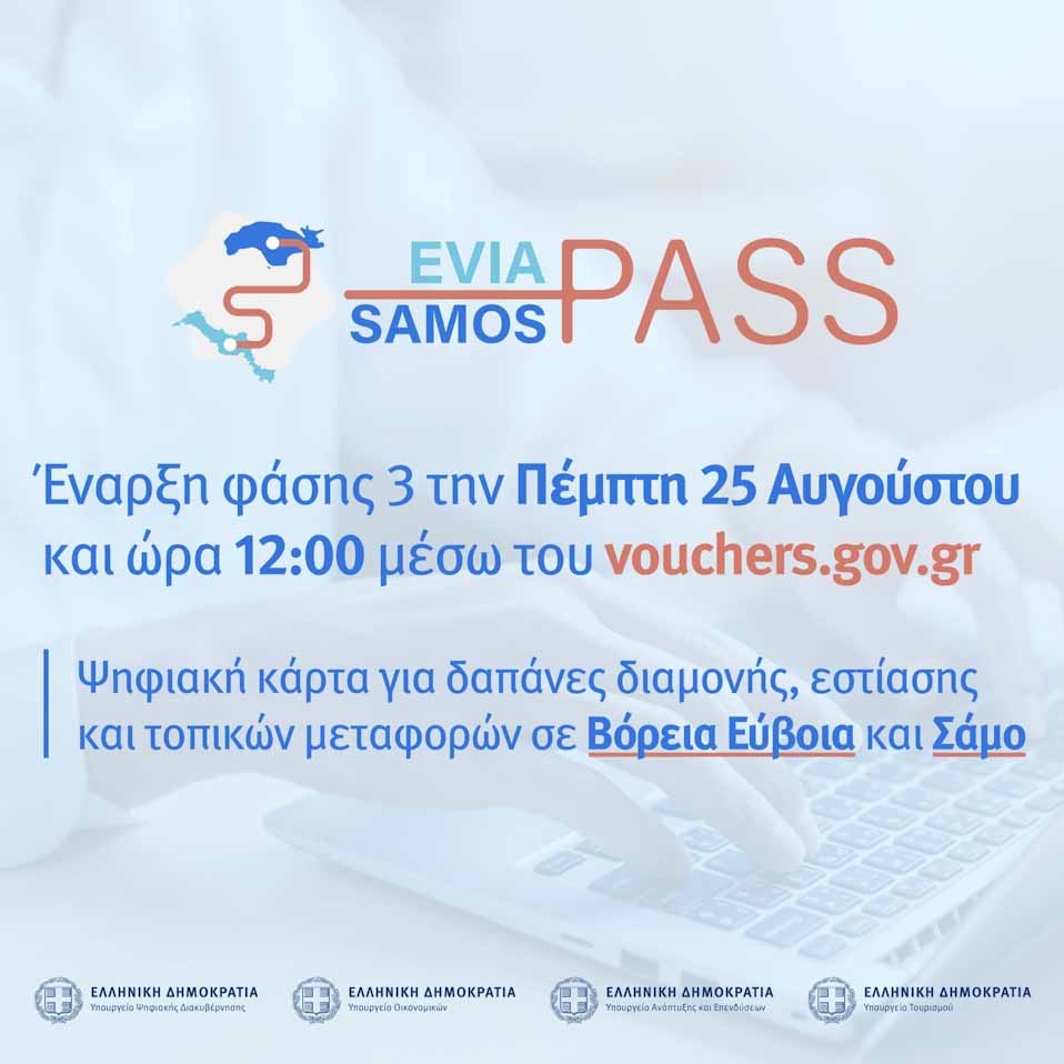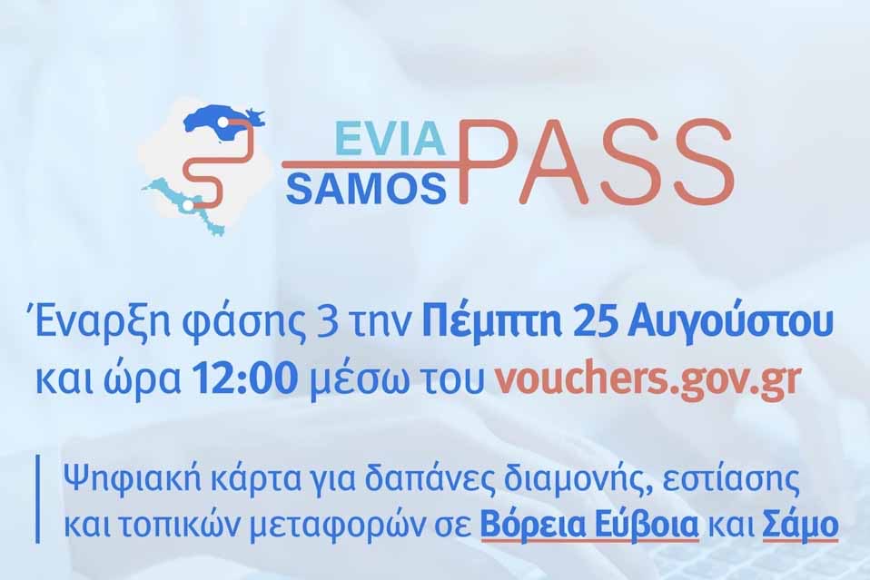 Αναλυτικός οδηγός υπό μορφή ερωταπαντήσεων βρίσκεται στο vouchers.gov.gr/eviasamospass και για οποιαδήποτε περαιτέρω διευκρίνιση ο πολίτης μπορεί να απευθύνεται στο 215 215 7841 (Δευτέρα έως Παρασκευή και ώρες 09:00 – 17:00).