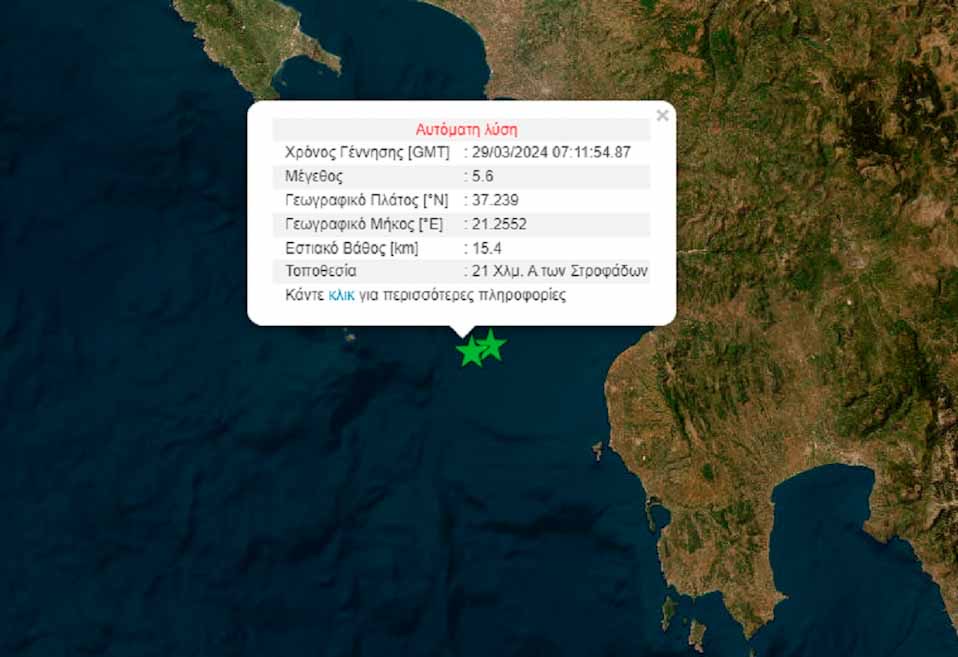 Το επίκεντρο της δόνησης εντοπίζεται στο θαλάσσιο χώρο 14 χλμ. Ανατολικά των Στροφάδων.