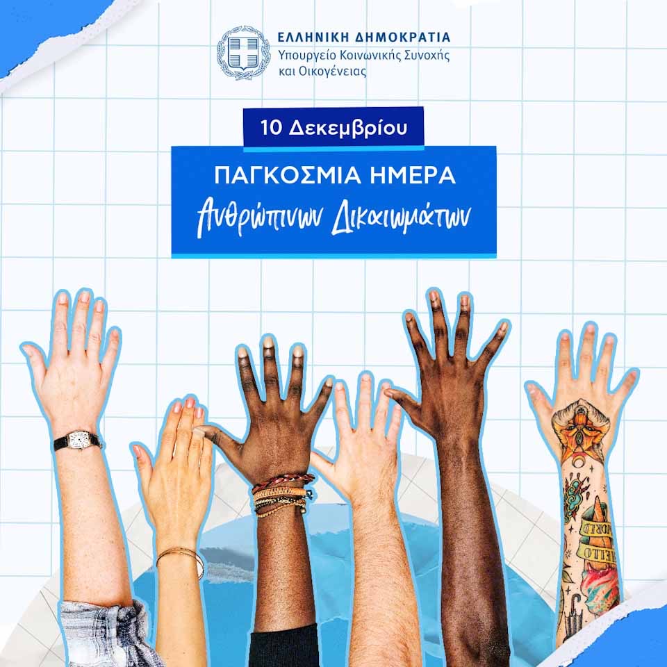Η Παγκόσμια Ημέρα Ανθρωπίνων Δικαιωμάτων γιορτάζεται κάθε χρόνο στις 10 Δεκεμβρίου, σε ανάμνηση της υπογραφής της Παγκόσμιας Διακήρυξης των Ανθρωπίνων Δικαιωμάτων από τη Γενική Συνέλευση του ΟΗΕ στις 10 Δεκεμβρίου 1948. Το Υπουργείο Κοινωνικής Συνοχής και Οικογένειας παραμένει αταλάνταυτα προσηλωμένο στην καταπολέμηση των διακρίσεων και εργάζεται με επιμονή για την προάσπιση των δικαιωμάτων του ανθρώπου.