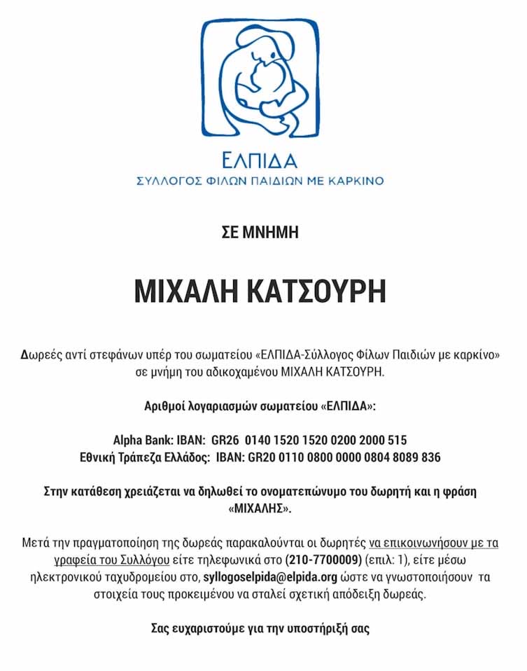 Με μήνυμά της, η οικογένεια του δολοφονημένου Μιχάλη καλεί όσους θέλουν να τιμήσουν την μνήμη του αντί στεφάνων να κάνουν δωρεές στο σωματείο «ΕΛΠΙΔΑ-Σύλλογος Φίλων Παιδιών με καρκίνο».
