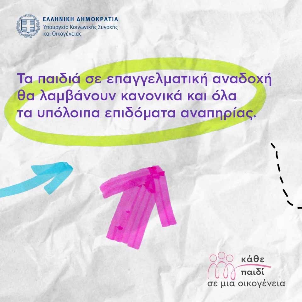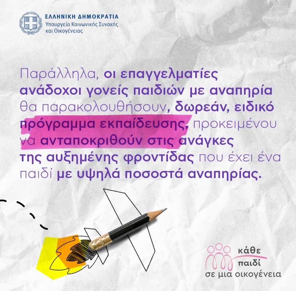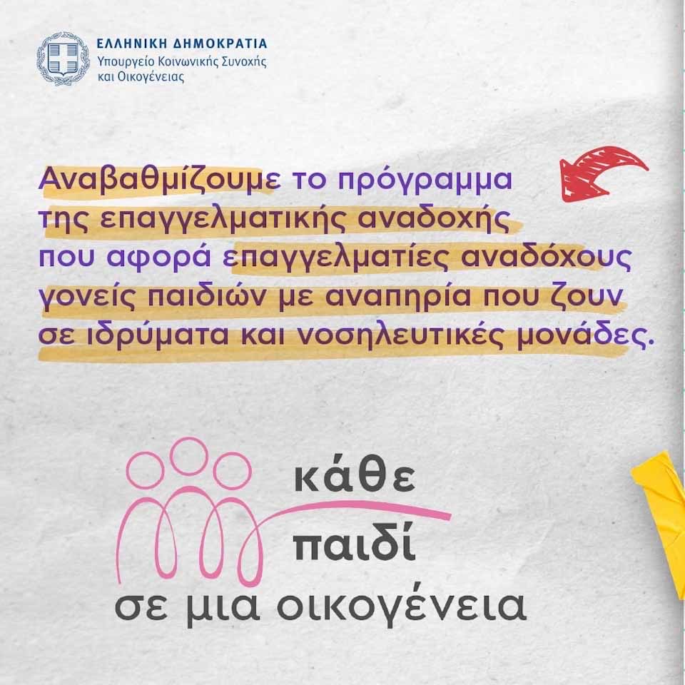 Αναβαθμίζεται το πρόγραμμα της επαγγελματικής αναδοχής του Υπουργείου Κοινωνικής Συνοχής και Οικογένειας, που αφορά επαγγελματίες αναδόχους γονείς παιδιών με αναπηρία που ζουν σε ιδρύματα και νοσηλευτικές μονάδες, προκειμένου να δοθεί η δυνατότητα στα παιδιά αυτά να ζήσουν σε ένα σταθερό και ασφαλές οικογενειακό περιβάλλον.