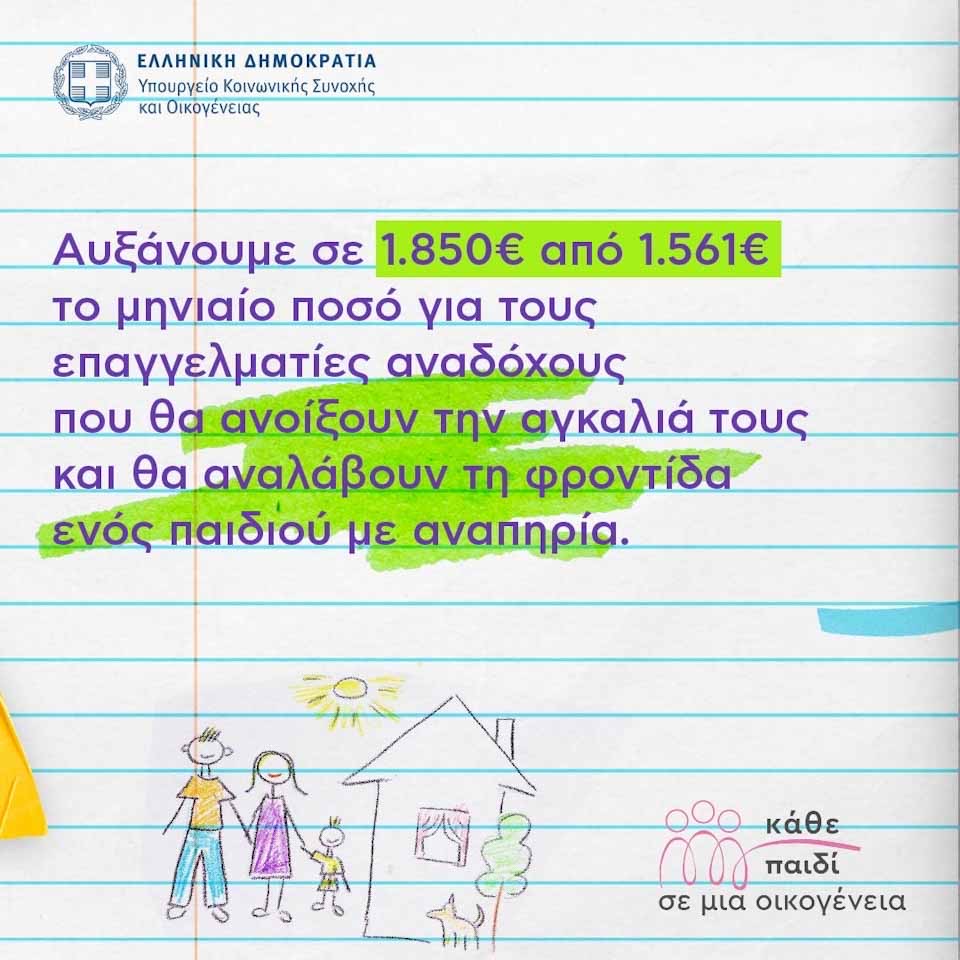 Ειδικότερα, όπως προβλέπεται στη νέα κοινή απόφαση (αρθ.8102/31.12.2024, Β΄7304) του Αναπληρωτή Υπουργού Εθνικής Οικονομίας και Οικονομικών, Νίκου Παπαθανάση, της Υπουργού Κοινωνικής Συνοχής και Οικογένειας, Σοφίας Ζαχαράκη, του Υπουργού Ψηφιακής Διακυβέρνησης, Δημήτρη Παπαστεργίου και των Υφυπουργών Εθνικής Οικονομίας και Οικονομικών, Θανάση Πετραλιά και Εργασίας και Κοινωνικής Ασφάλισης, Παναγιώτη Τσακλόγλου, θα καταβάλλεται μηνιαία αποζημίωση της τάξεως των 1.850 ευρώ στους επαγγελματίες αναδόχους γονείς παιδιών με αναπηρία, καθώς οι περισσότεροι υποψήφιοι θετοί ή ανάδοχοι γονείς επιθυμούν να συνδεθούν με παιδιά τυπικής ανάπτυξης και ηλικίας έως και 4 ετών.