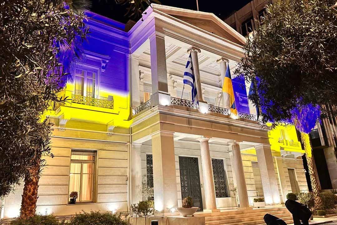 Το υπουργείο εξωτερικών φώτισε το κτίριο του στα χρώματα της ουκρανικής σημαίας, καθώς σήμερα σηματοδοτεί την τέταρτη επέτειο της επιθετικότητας της Ρωσίας κατά της Ουκρανίας.