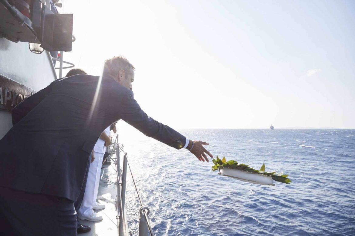 Στεφάνι στον υγρό τάφο του καταδρομικού «’Ελλη» που βυθίστηκε στις 15 Αυγούστου του 1940, ανήμερα της Γιορτής της Παναγίας, από το ιταλικό υποβρύχιο «Ντελφίνο» έριξε ο πρωθυπουργός Κυριάκος Μητσοτάκης, ο οποίος συμμετέχει στις εκδηλώσεις για τον εορτασμό της Κοιμήσεως της Θεοτόκου και για την επέτειο του τορπιλισμού.