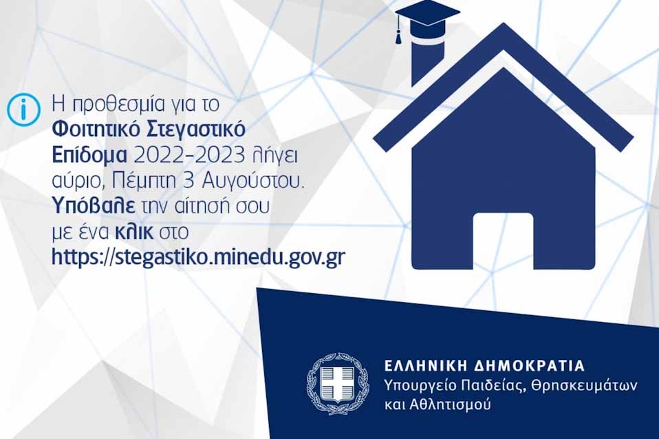 Το Υπουργείο Παιδείας, Θρησκευμάτων και Αθλητισμού ενημερώνει τους ενδιαφερόμενους-δικαιούχους του στεγαστικού επιδόματος για το ακαδημαϊκό έτος 2022-2023, ότι έως και την Πέμπτη 3 Αυγούστου 2023, μπορούν να υποβάλουν ηλεκτρονική αίτηση για τη χορήγησή του.