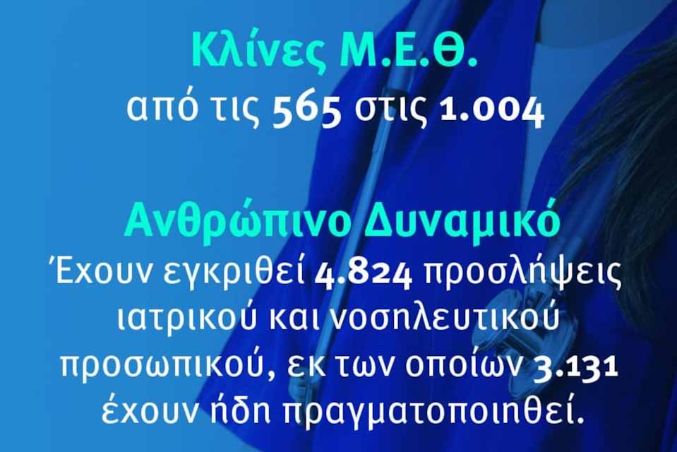 Συνεχίζουμε τις προσλήψεις ιατρικού και νοσηλευτικού προσωπικού, τη δημιουργία νέων Μ.Ε.Θ., την προμήθεια πρόσθετου υγειονομικού υλικού. Έχουμε, ήδη, αυξήσει τις Μ.Ε.Θ. από τις 565 στις 1.004, δηλαδή αύξηση κατά 78% και συνεχίζουμε την προσπάθεια. Παράλληλα, έχουν ήδη πραγματοποιηθεί 3.131 προσλήψεις, εκ των οποίων 384 ιατρικό προσωπικό και 2.747 νοσηλευτικό και λοιπό υγειονομικό προσωπικό. Οι εγκρίσεις για νέες προσλήψεις φτάνουν τις 4.824, δηλαδή περίπου 2,5 φορές πάνω από τις αρχικά εγκριθείσες 2.000 προσλήψεις.