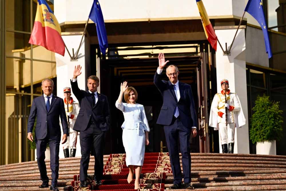 Ο Πρόεδρος της Γαλλίας Εμανουέλ Μακρόν, ο Καγκελάριος της Γερμανίας Φρίντριχ Μερτς και ο Πρωθυπουργός της Πολωνίας Ντόναλντ Τουσκ επισκέπτονται τη Μολδαβία για την Ημέρα Ανεξαρτησίας της χώρας (1991), σε μια υψηλού συμβολισμού κίνηση, έναν μήνα πριν της εκλογές στη χώρα.