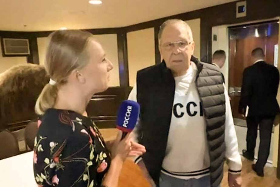 Ο Σεργκέι Λαβρόφ φορώντας μπλουζάκι με τα αρχικά της Σοβιετικής Ένωσης, σε μία κίνηση που ερμηνεύτηκε από δυτικά μέσα ως «πρόκληση».