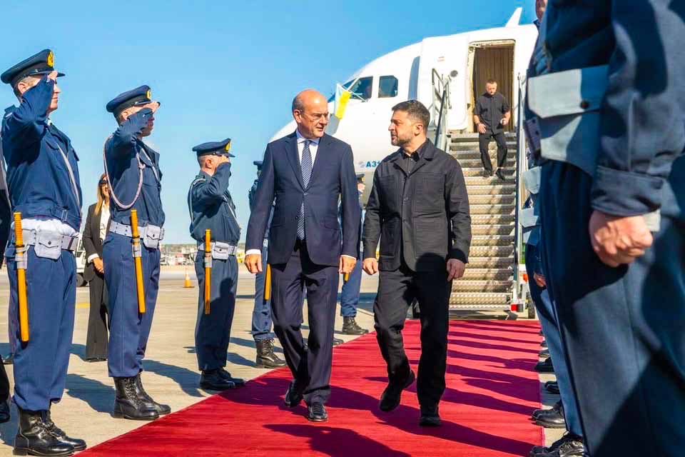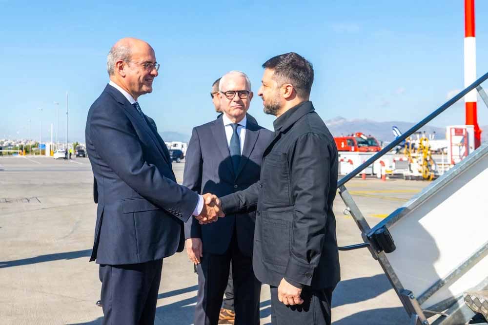 Λίγο αργότερα, ο κ. Ζελένσκι αποβιβάστηκε από το αεροσκάφος και είχε σύντομη συνομιλία με τον αντιπρόεδρο της κυβέρνησης Κωστή Χατζηδάκη, που τον υποδέχθηκε.