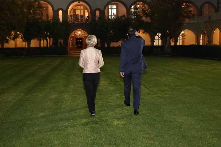 Πριν από την έναρξη του δείπνου, ο Πρόεδρος Χριστοδουλίδης ξενάγησε την κα Ursula von der Leyen στους κήπους του Προεδρικού Μεγάρου.