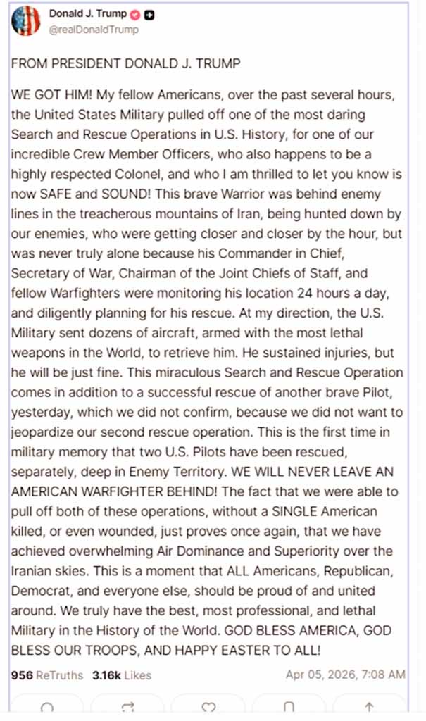 «Τον έχουμε! Φίλοι μου Αμερικανοί, τις τελευταίες ώρες, ο στρατός των ΗΠΑ πέτυχε μία από τις πιο τολμηρές επιχειρήσεις έρευνας και διάσωσης στην αμερικανική ιστορία για έναν από τους πιο εκπληκτικούς αξιωματικούς μας, που τυχαίνει να είναι ένας αξιωσέβαστος συνταγματάρχης, για τον οποίο θέλω να σας ανακοινώσω πως είναι ΣΩΟΣ ΚΑΙ ΑΒΛΑΒΗΣ!», αναφέρει μεταξύ άλλων στην ανάρτησή του ο Τραμπ.