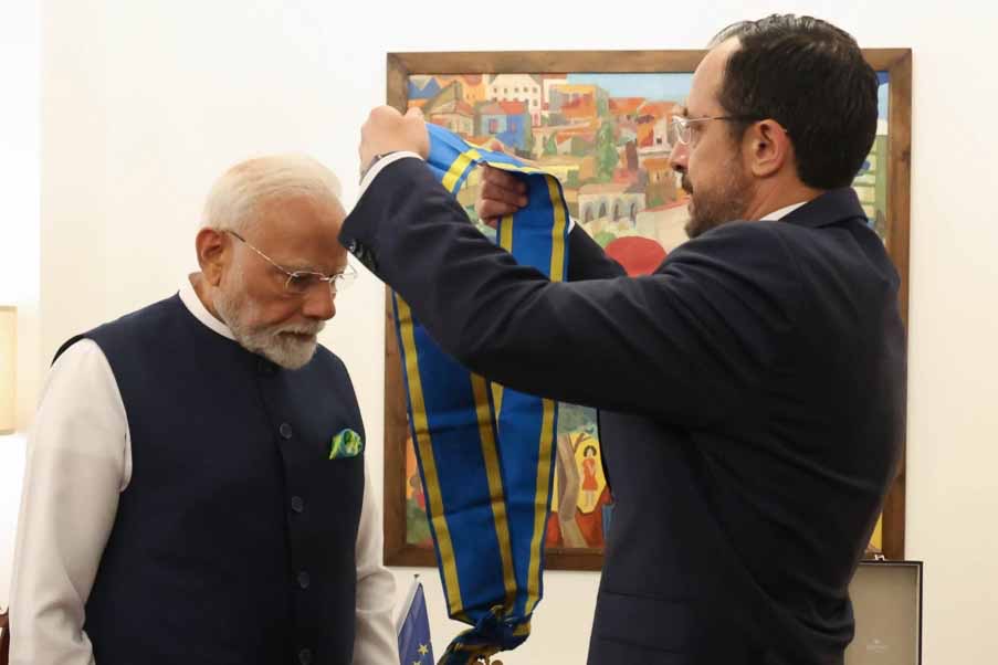 Ακολούθησε η παρασημοφόρηση του Πρωθυπουργού της Ινδίας από τον Πρόεδρο της Δημοκρατίας με τον Μεγαλόσταυρο του Τάγματος του Μακαρίου Γ΄.
