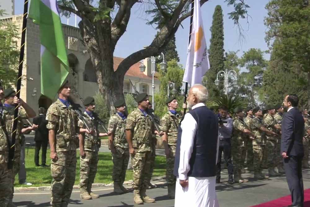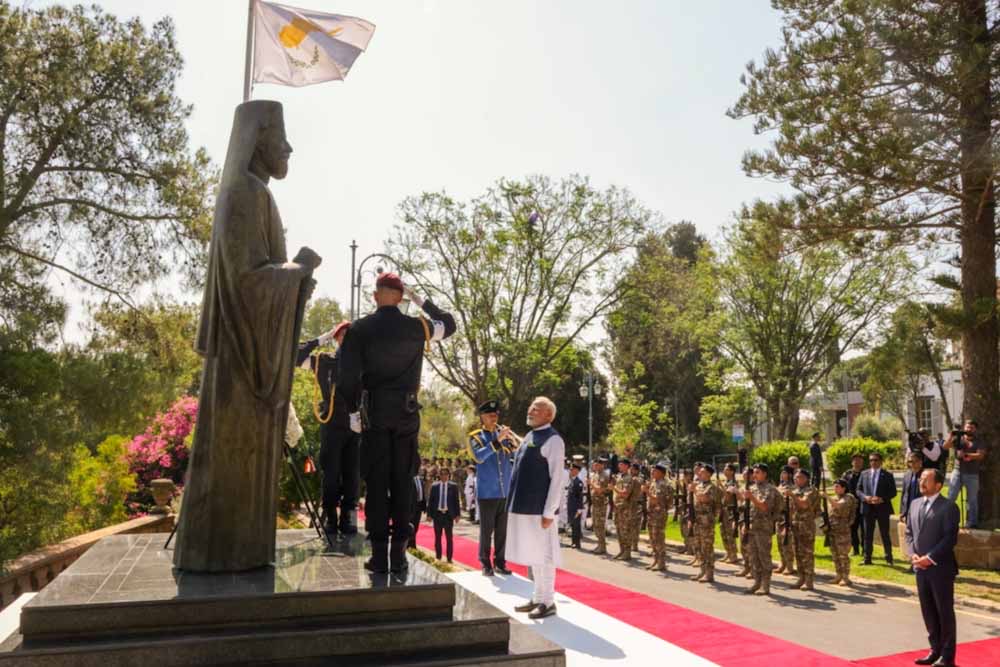 Ο κ. Modi έφτασε το πρωί στο Προεδρικό Μέγαρο, όπου τον υποδέχθηκε ο Πρόεδρος Χριστοδουλίδης, ενώ στρατιωτικό άγημα απέδιδε τιμές. Έγινε ανάκρουση των Εθνικών Ύμνων και ακολούθως ο Πρωθυπουργός της Ινδίας κατέθεσε στεφάνι στον ανδριάντα του Αρχιεπισκόπου Μακαρίου Γ΄.