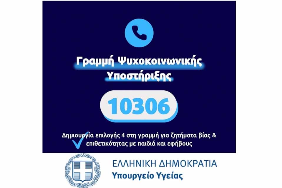 Νέα ειδική επιλογή στην Τηλεφωνική Γραμμή Ψυχοκοινωνικής Υποστήριξης 10306, για ζητήματα βίας και επιθετικότητας με παιδιά και εφήβους, λειτουργεί από χθες. Ο αρμόδιος υφυπουργός Υγείας Δημήτρης Βαρτζόπουλος ανακοίνωσε την καθημερινή λειτουργία της για γονείς, εκπαιδευτικούς και κάθε εμπλεκόμενο για συμβουλευτική και υποστήριξη σε θέματα διαχείρισης και πρόληψης βίας και επιθετικότητας παιδιών και εφήβων, στο πλαίσιο της προσπάθειας διαχείρισης και αντιμετώπισης των ψυχοκοινωνικών επιπτώσεών τους.