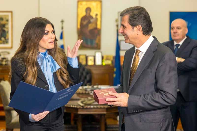 Η συνάντηση ολοκληρώθηκε με την εθιμοτυπική ανταλλαγή δώρων, με τον Υφυπουργό να προσφέρει στην Πρέσβειρα μία σφραγίδα.